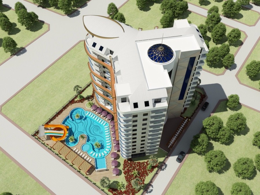 Detta bostadsområde består av en stor och underbar byggnad formad som en Y. Det är elva våningar högt och innehåller 88 lägenheter, som täcker varje smak och behov. På varje våning finns fyra lägenheter med två sovrum och fyra med ett sovrum. På toppen finns takvåningar med två eller fyra sovrum, fördelade på två våningar. Alla lägenheter har vackra planeringslösningar, och med en utsökt design och utförande.